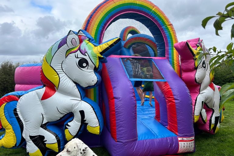 Eine Hüpfburg in Form eines farbenfrohen Einhorns ist der perfekte Höhepunkt für jedes Kinderfest!